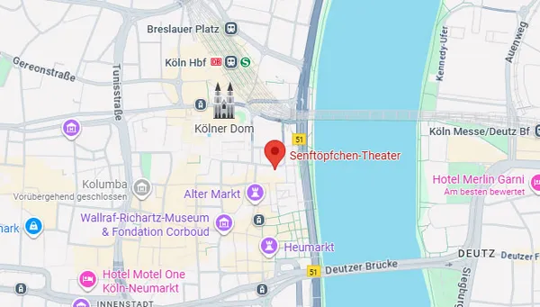 Das Senftöpfchen liegt im Herzen der Kölner Altstadt, knapp fünf Minuten Fußweg vom Hauptbahnhof und den KVB-Haltestellen Rathaus bzw. Dom/Hbf entfernt. Autofahrer orientieren sich in Richtung Dom/Hbf und Philharmonie. Die Parkhäuser Groß St. Martin, Philharmonie und Parkhaus Am Dom, befinden sich in unmittelbarer Nähe des Theaters.
